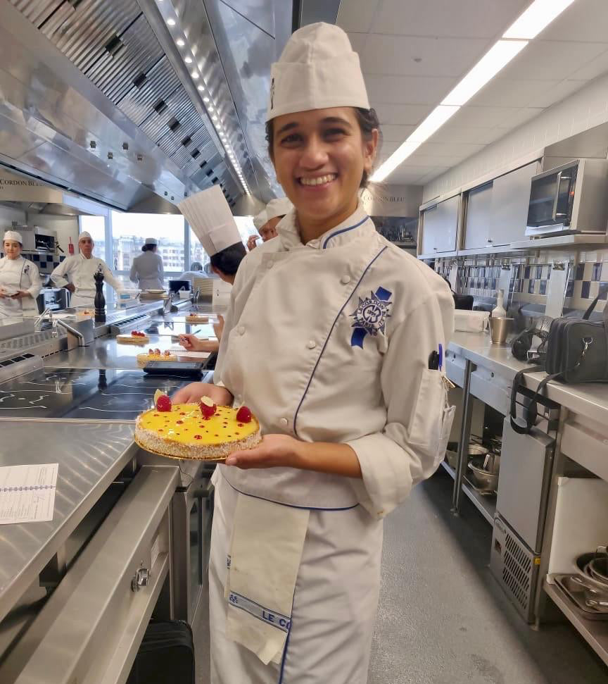 Trained by the finest from Le Cordon Bleu, Paris earning her Diplome de Patisserie in 2019, she went on to work at Le Royal Monceau Paris with Pierre Herme's team.