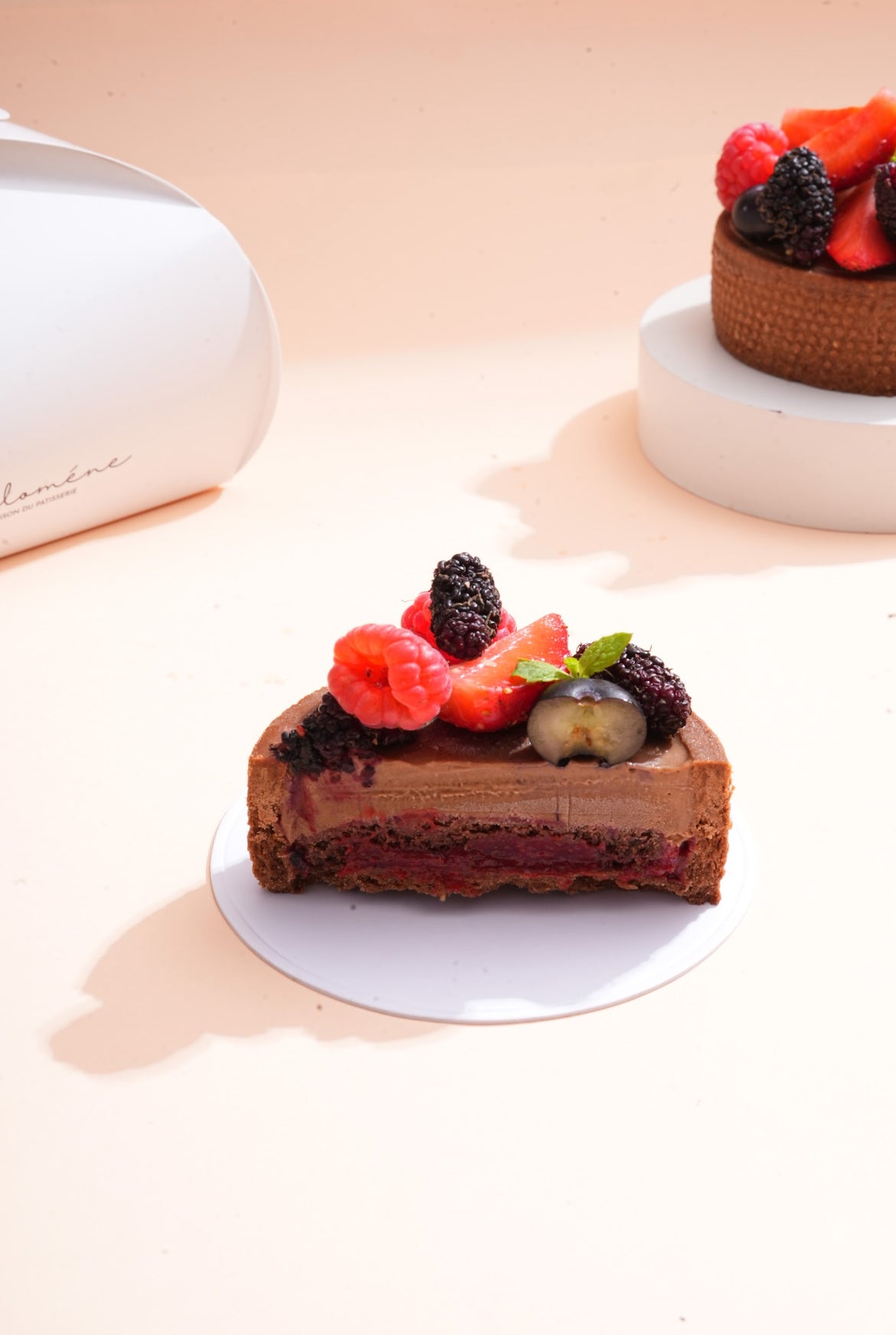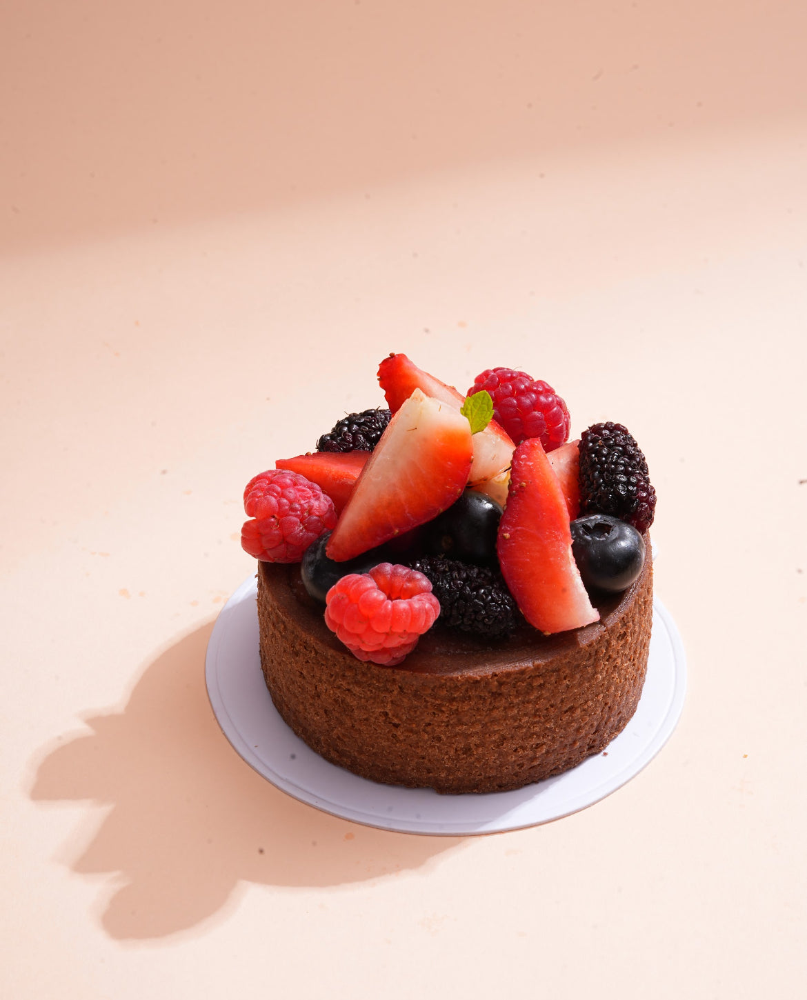 Sweet pastry tart filled with dark chocolate brownie sponge, seasonal berry compote, dark chocolate pastry cream & topped with seasonal fresh berries