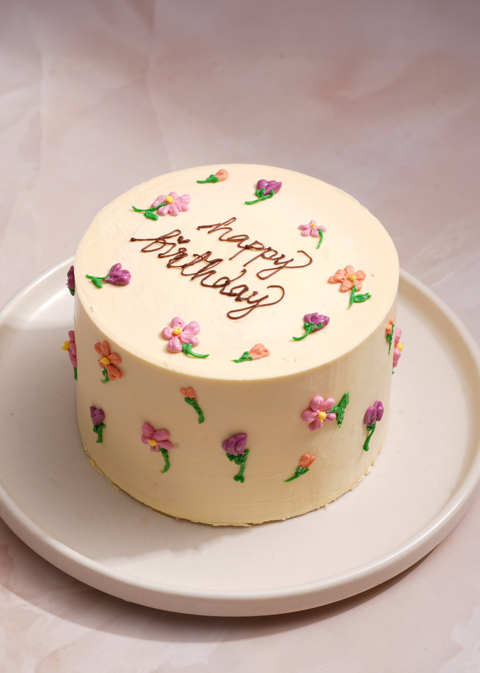 Layers of airy Vanilla Sponge, Vanilla Buttercream with a minimalist floral design
