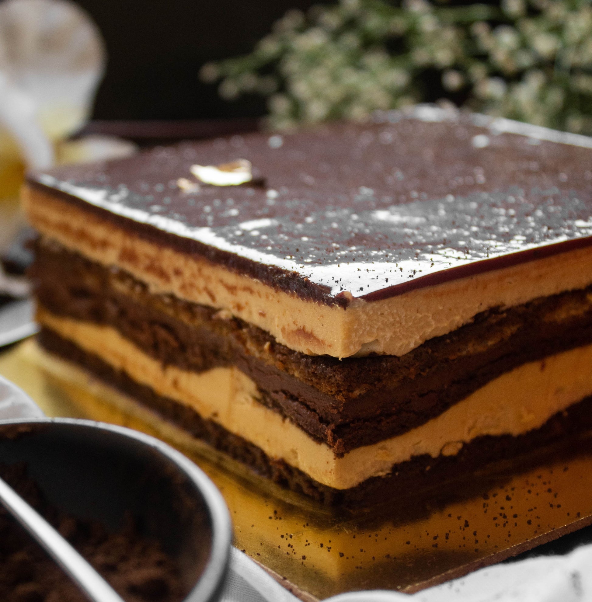 Layers of almond sponge soaked in coffee syrup, coffee buttercream & chocolate ganache