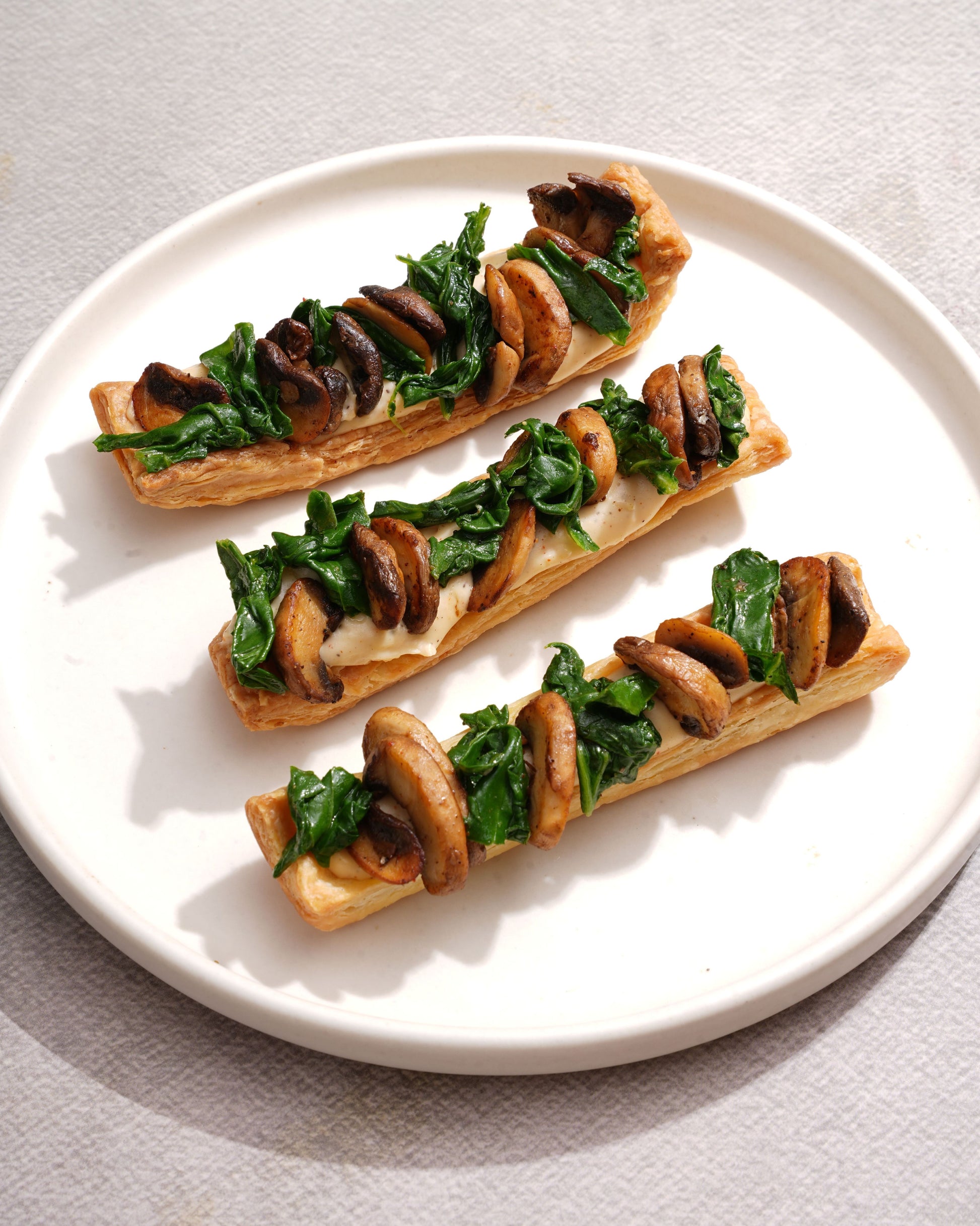 Puff pastry filled with bechamel sauce and topped with butter sauteed mushrooms & spinach with hint of pepper & paprika
