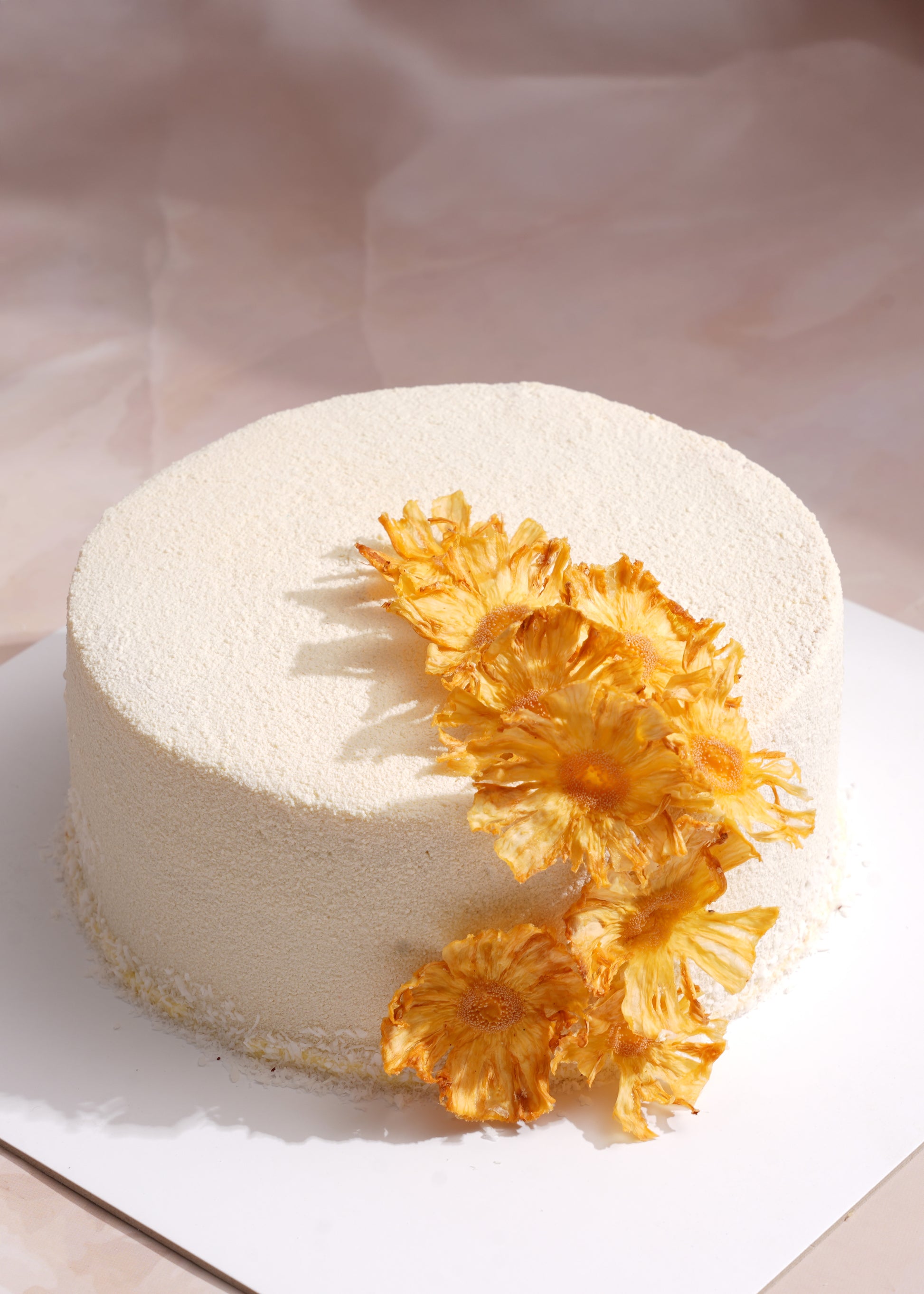 Gluten Free cake with layers of coconut dacquoise, coconut mousseline crème, macerated pineapple in lemon, white rum & a hint of pepper