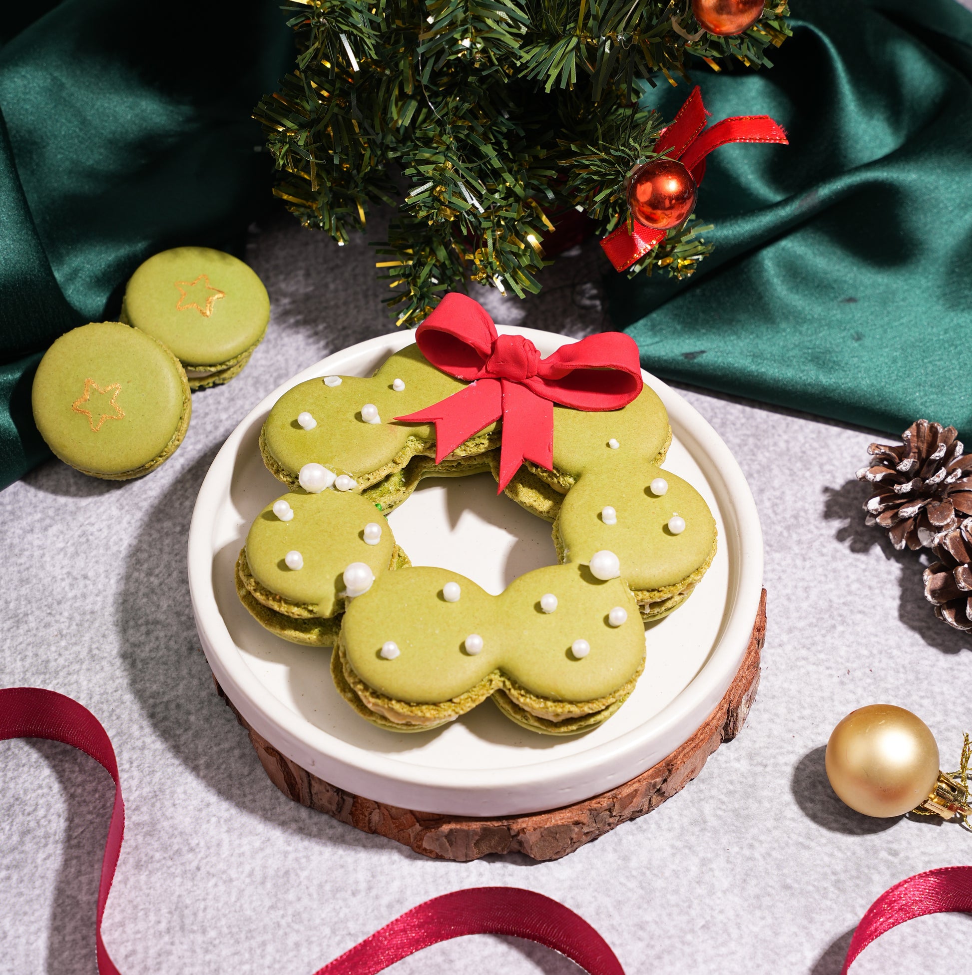 Box of 1 XXL Christmas Holly shaped macaron made with Italian meringue filled with milk chocolate passionfruit ganache.