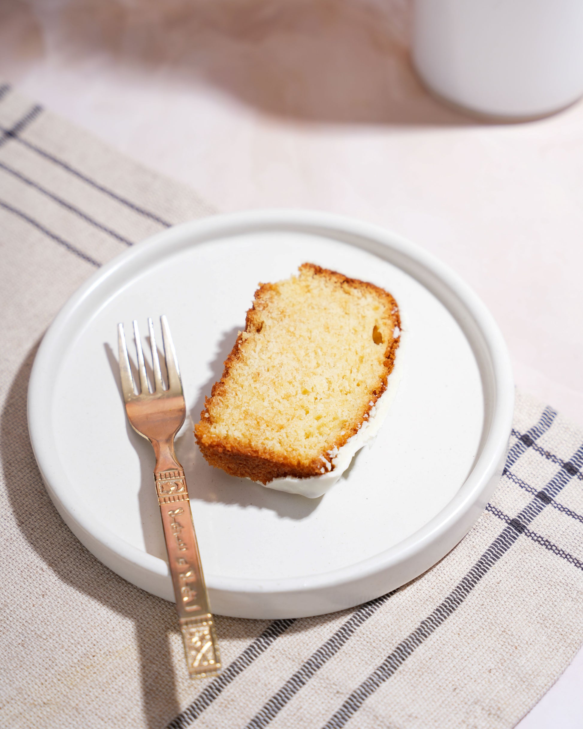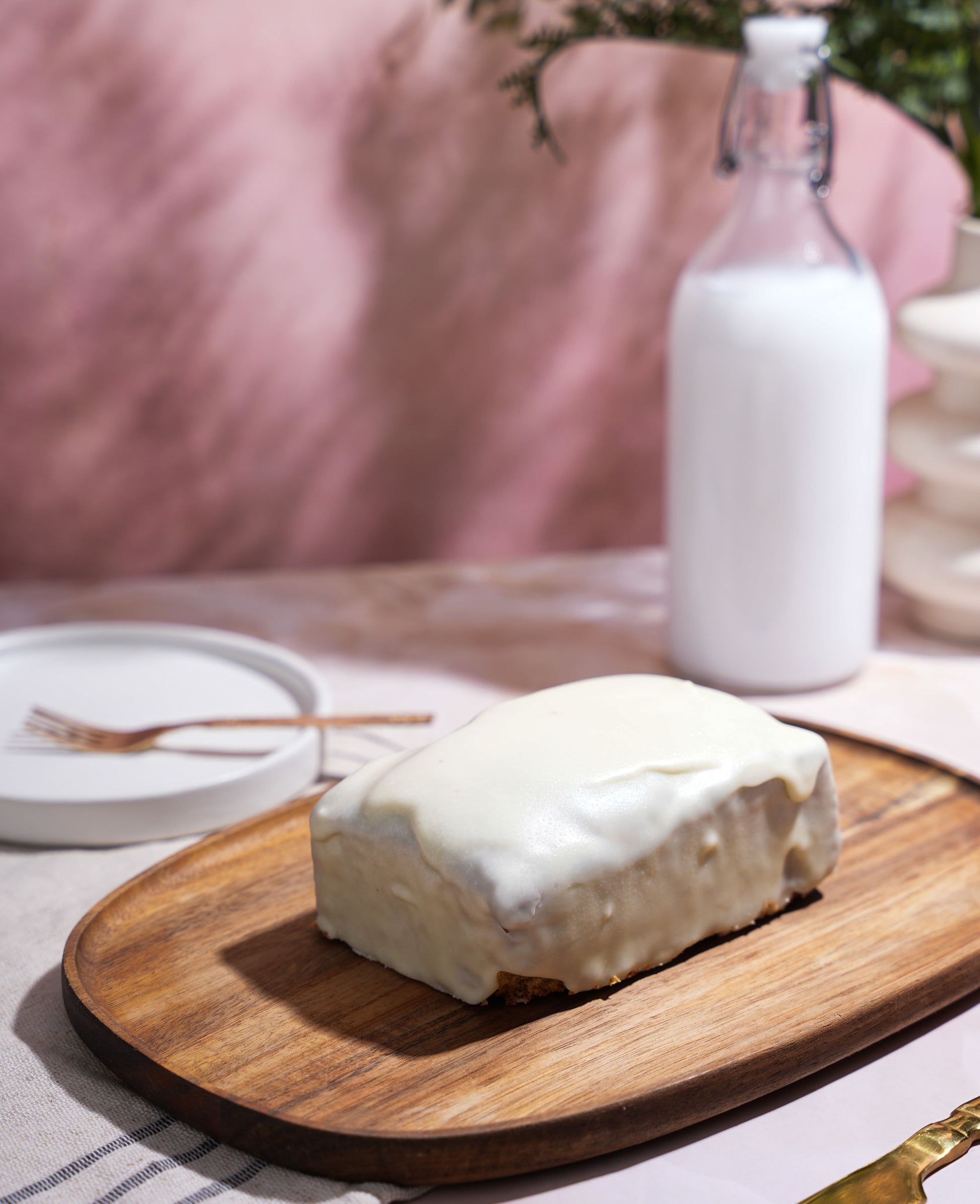 Vanilla almond travel cake, coated in white chocolate glaze.